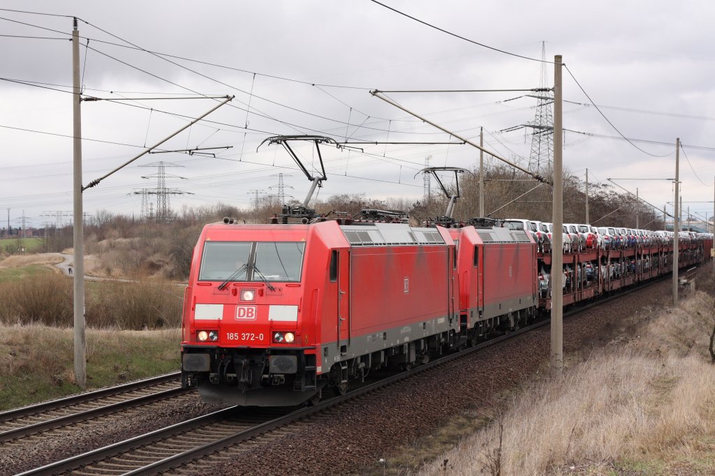 So etwas gibt es auf der KBS 310 selten zu sehen. Eine Doppeltraktion 185er mit 185 372-0 an der Spitze fährt mit einem Ganzzug Autotransportwagen in Richtung Braunschweig. Fotografiert am 21.03.2010 in Magdeburg Diesdorf.