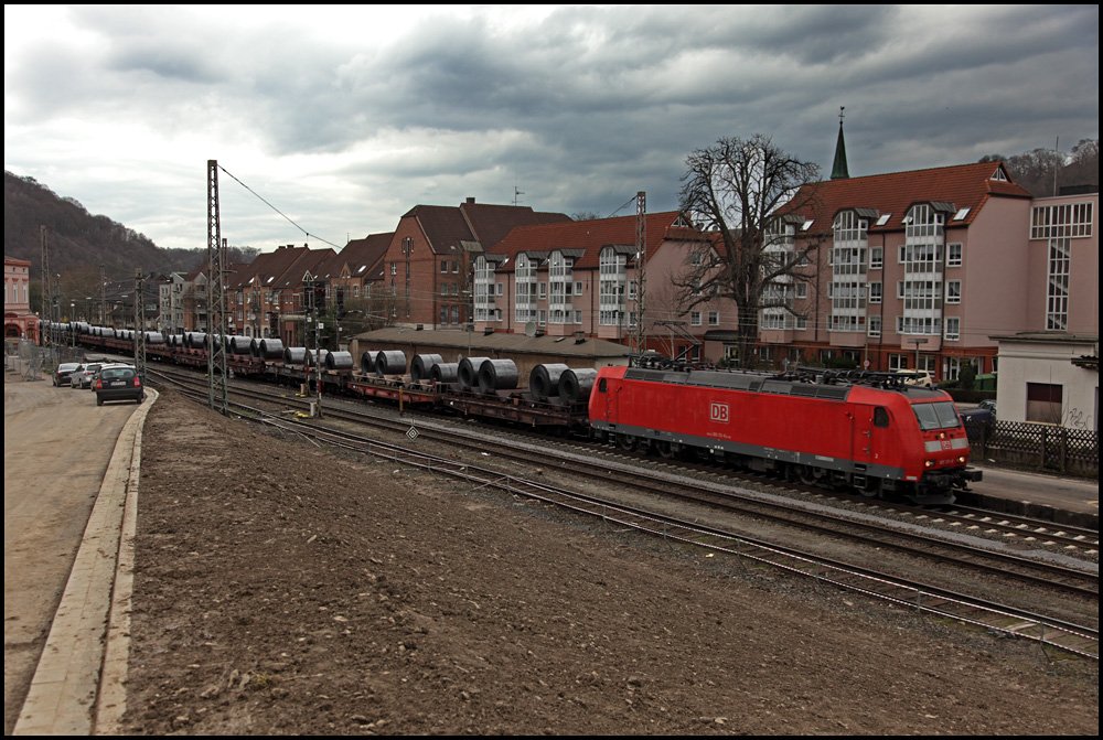 185 113 (9180 6185 113-6 D-DB) hat am 28.03.2010 die Aufgabe den "Harribo-Express", Bochum - Dillenburg, zu bespannen. Aufgenommen bei der Durchfahrt in Hohenlimburg.