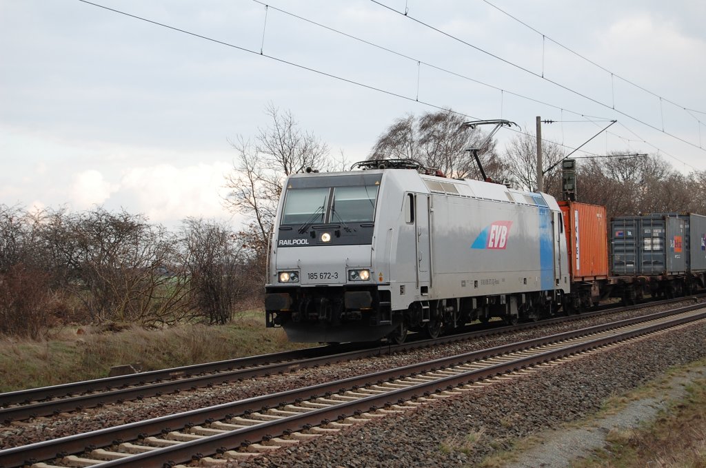 185 672-3 EVB am Nachmittag des 28.03.2010 kurz vor Überquerung des Mittellandkanals bei Peine