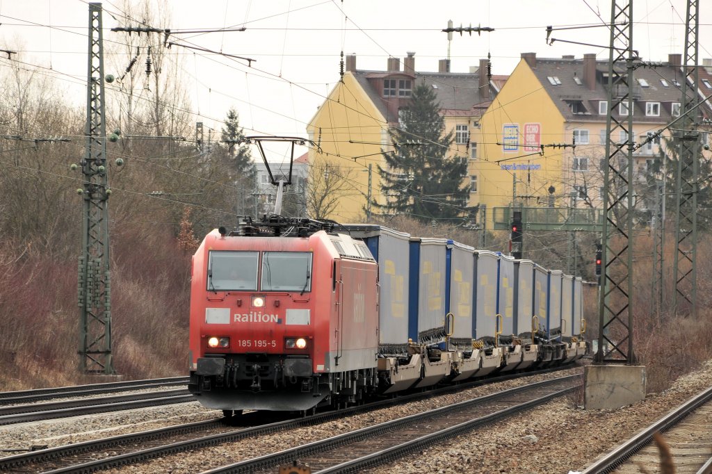 185 197-1 mit leeren Slp-s Wagen am Km 28,190 in Düsseldorf am 10.03.2010 um 14:01 Uhr