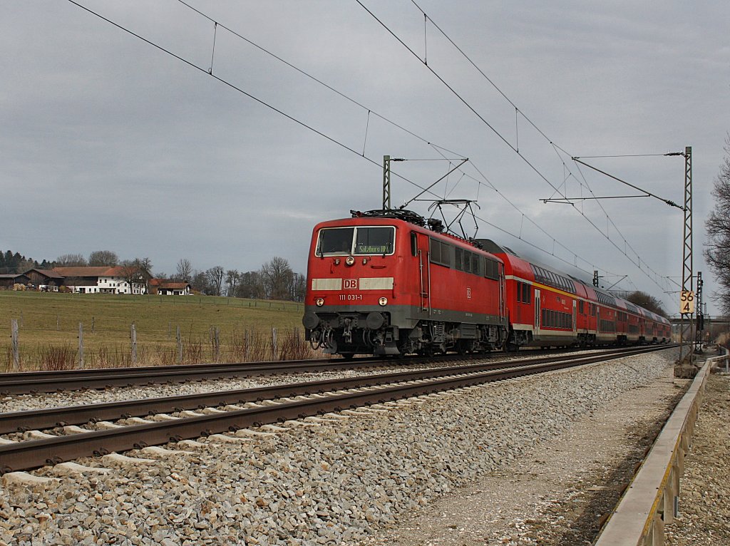 Die 111 031 mit dem RE nach Salzburg am 20.03.2010 unterwegs bim BÜ Vogel.