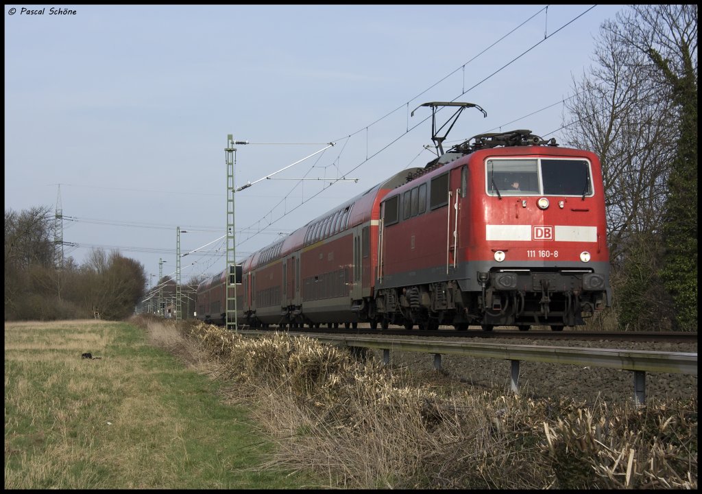 Der RE4 auf dem Weg zum Aachener Hbf an 28.4. Zuglok war die 111 160.