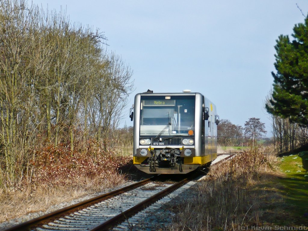 VT 672 905 der Burgenlandbahn fährt in den Haltepunkt Krauschwitz (Teuchern) ein. Er fährt als RB von Zeitz nach Nebra über Teuchern und Naumburg. (26.03.2010)