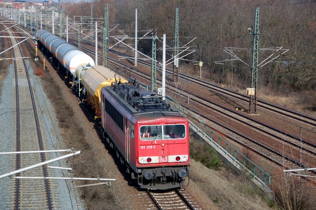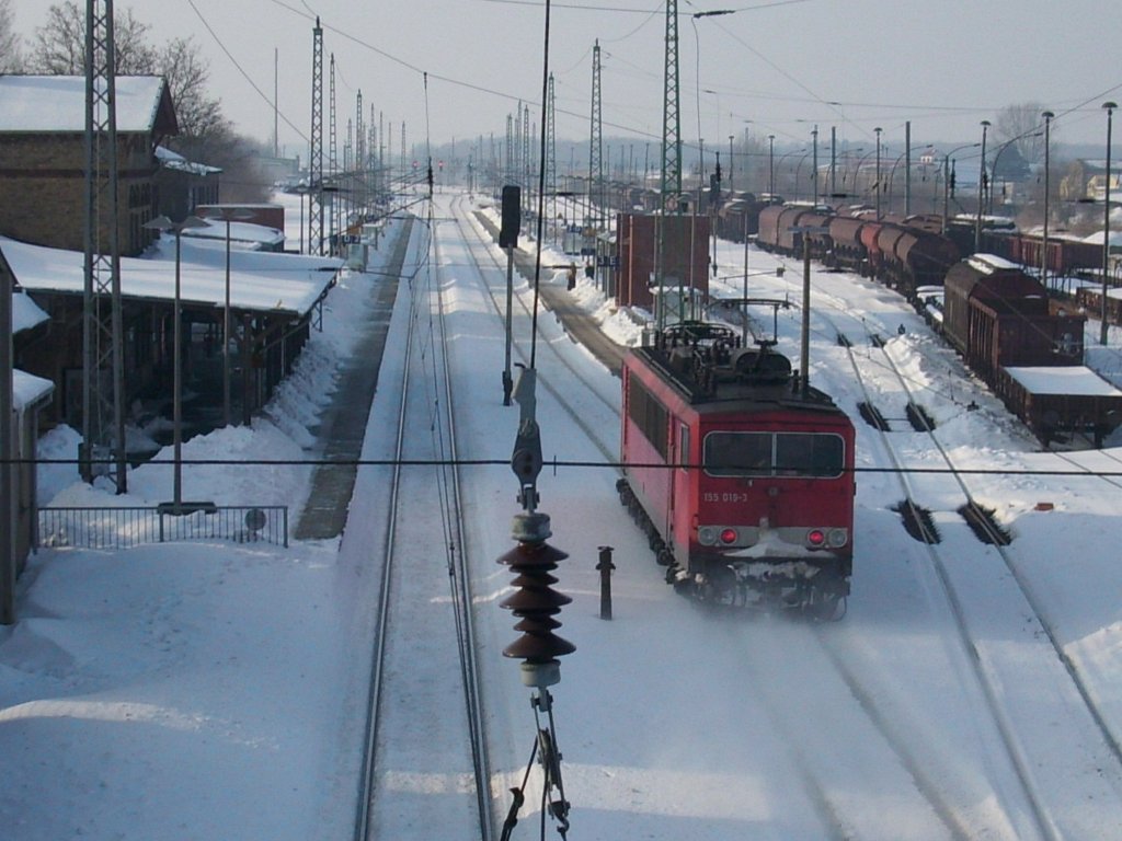 155 208 zieht am 03.03.10 einen kurzen Gz durch Holzweissig Richtung Leipzig.