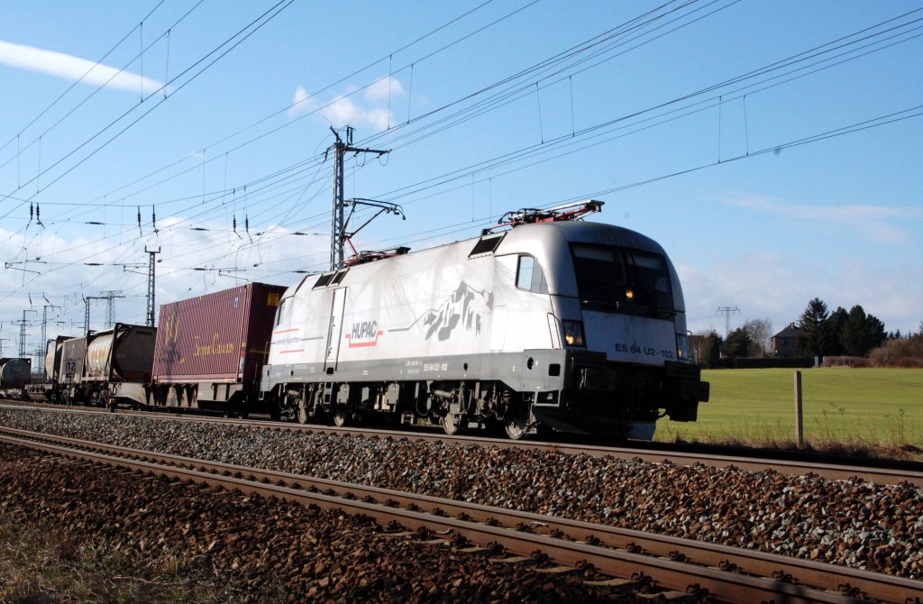 ES 64 U2 - 102 der HUPAC zieht am 27.02.10 einen Containerzug durch Eilenburg.