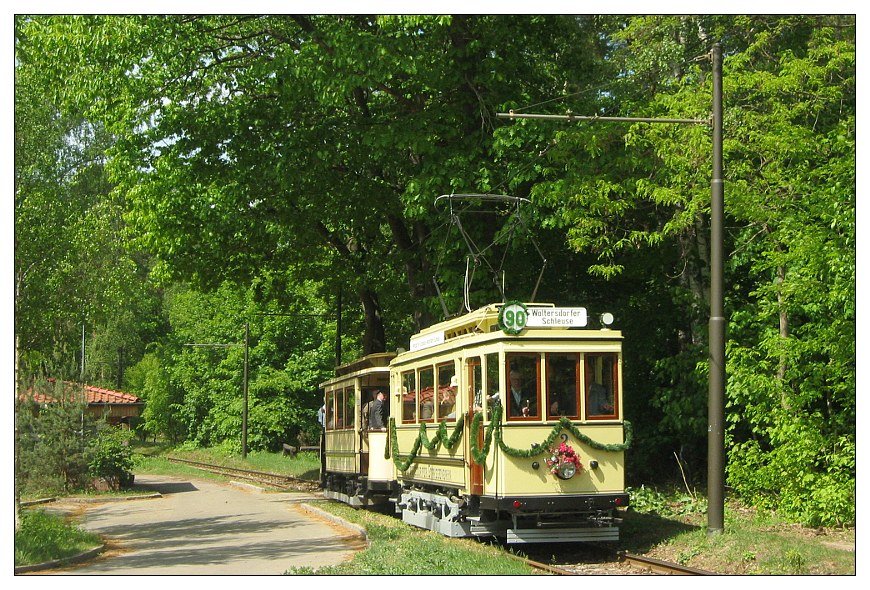 Tw 2 mit Bw 24 der Woltersdorfer Straßenbahn, aufgenommen am 17.05.2003 während des Festwochenendes zum 90. Streckenjubiläum. Dieser Tw war schon 1913 zur Eröffnung der Bahn in Woltersdorf im Einsatz!