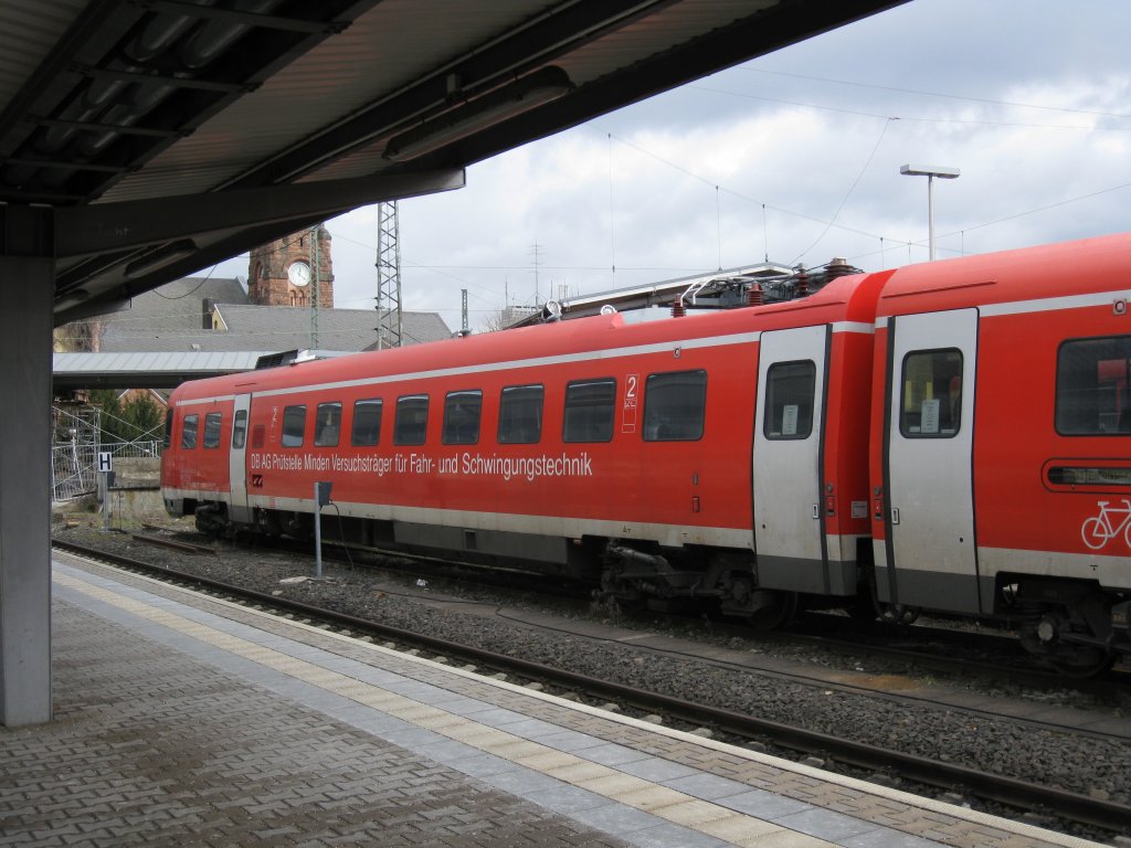 612 902 (Regioswinger) nicht unterwegs auf der Strecke, sondern für die DB AG Minden als Versuchsträger für Fahr- und Schwingungstechnick im Bahnhof Gießen am 01.03.2010. Die Besonderheit: über Tür 2 ist ein Stromabnehmer angebracht.