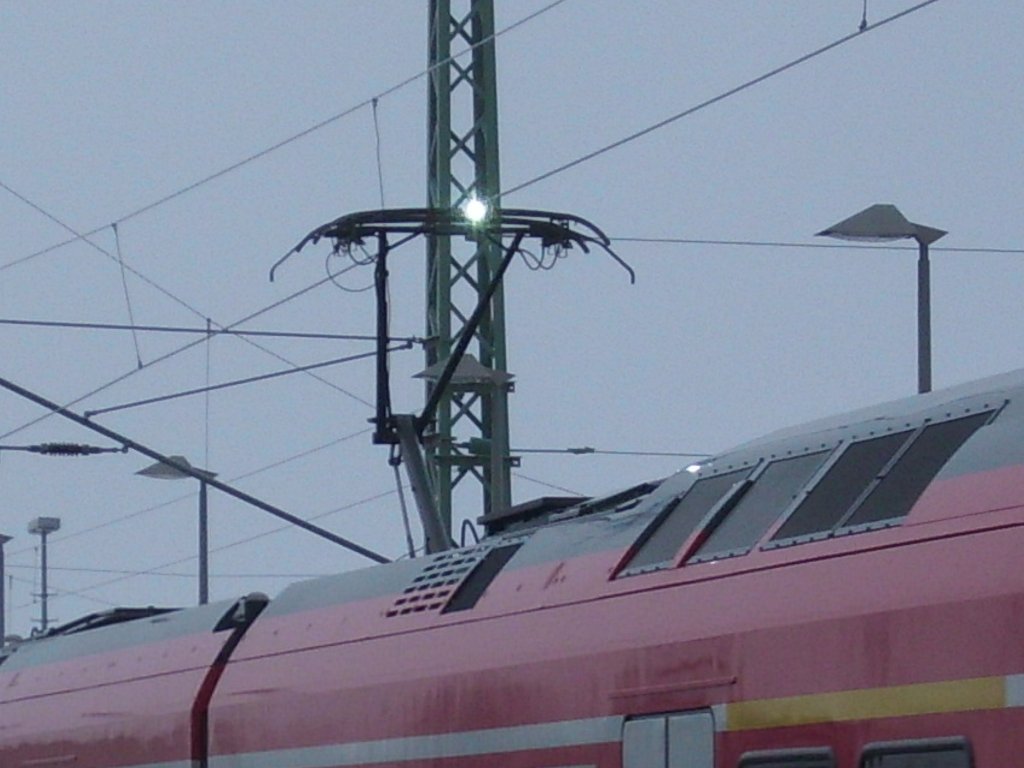 Das passiert wenn die Fahrleitung vereist ist.Aufgenommen an einem Flirt bei der Ausfahrt aus Bergen/Rügen.