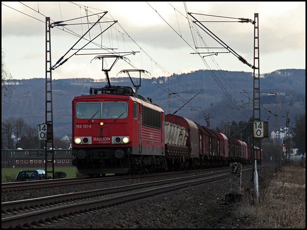 Der "Stromcontainer" 155 131 (9180 6155 131-6 D-DB) hat die Aufgabe den abendlichen Güterzug Hohenlimburg -> Hagen zubespannen. An erster Stelle läuft ein Flachwagen mit Conatinern mit die für den Transport von Klärschlamm verwendet werden. (04.03.2010)