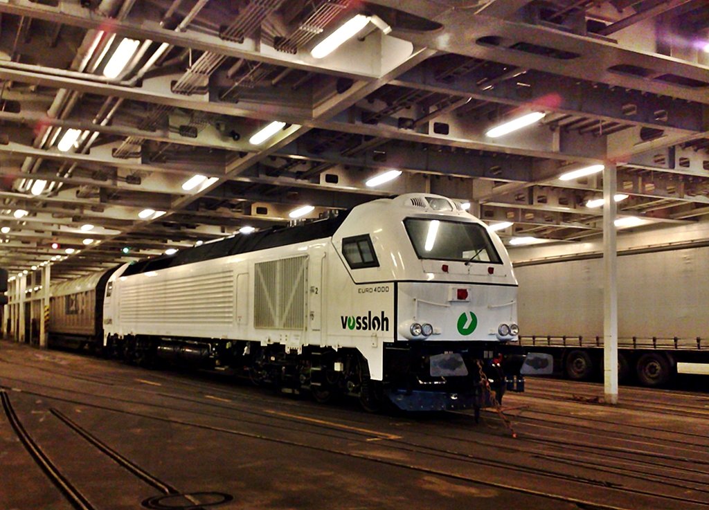 Vossloh EURO 4000 an Deck festgemacht des FS "Mecklenburg-Vorpommern" am 04.11.08 bei der Überführung nach Schweden von Rostock-Überseehafen