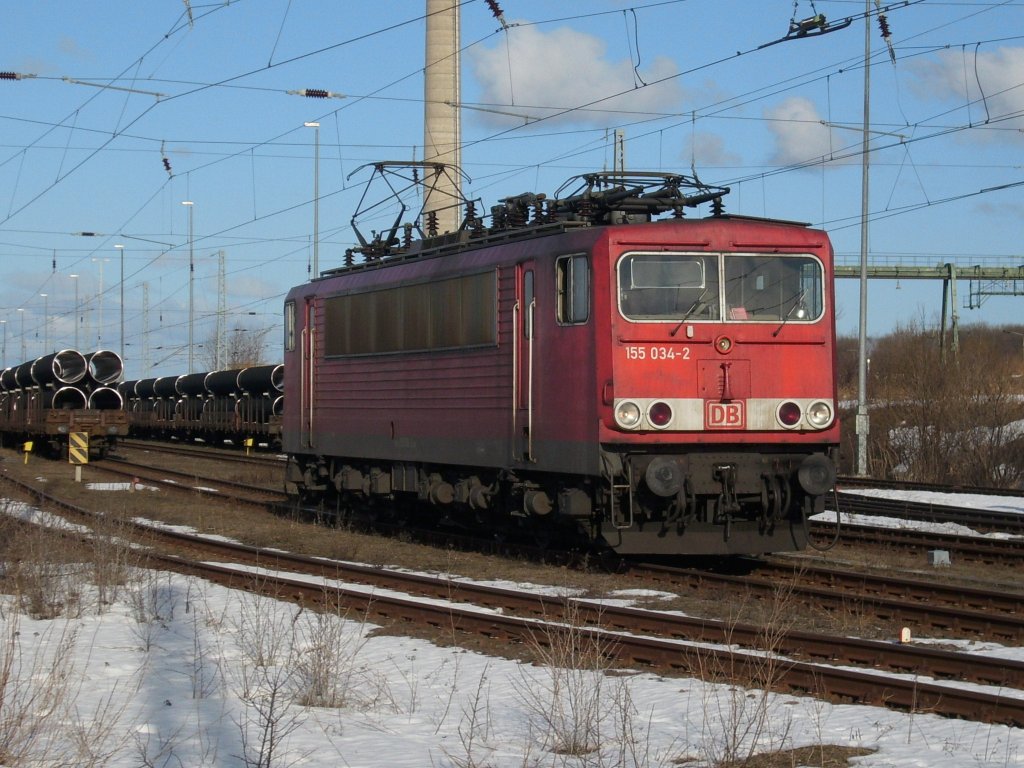 155 034 brachte am 05.März 2010 wieder einen Ganzzug mit Rohren nach Mukran.Hier verließ die Lok in Mukran ihren Zug um bis zur Rückleistung sich am ehmaligen Haltepunkt Mukran-Mitte auszuruhen.