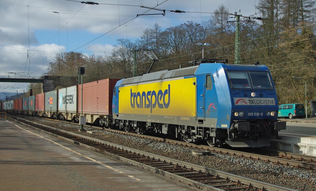 185 086-6 legt sich an der Bahnhofseinfahrt Radolfzell mit CS 49156 Bludenz/A - Bremerhaven-Kaiserhafen in die Kurve. 05.03.10
