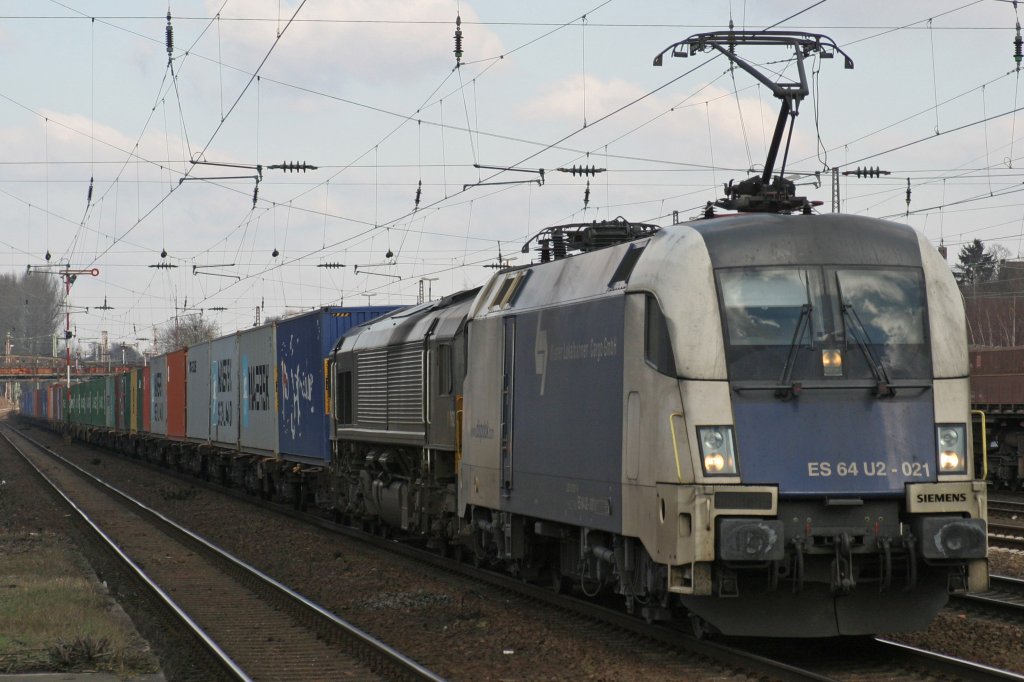 Als hätte sie sich für diesen sonnigen Wintertag herausgeputzt, rollt Re 482 048-6 mit einem Containerzug am 19.02.2010 über die KBS 380 Richtung Hannover.
