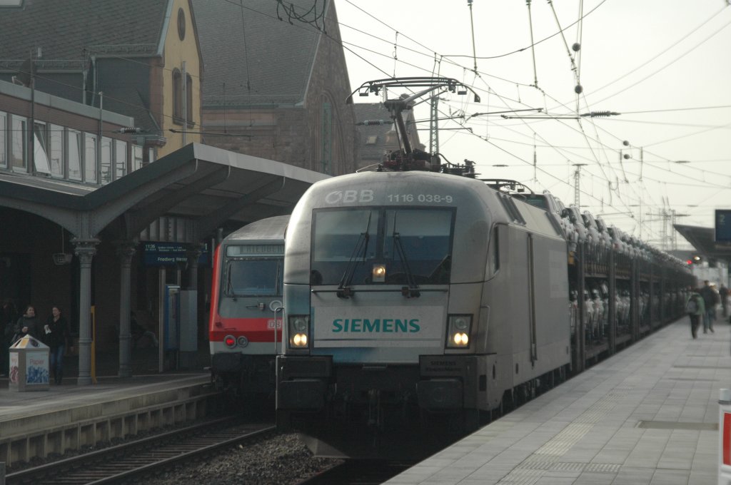 1116-038-9 der ÖBB am 30.10.2009 vor einem Autotransportzug nach dem Lokführerwechsel vor der Weiterfahrt im Bahnhof Gießen.