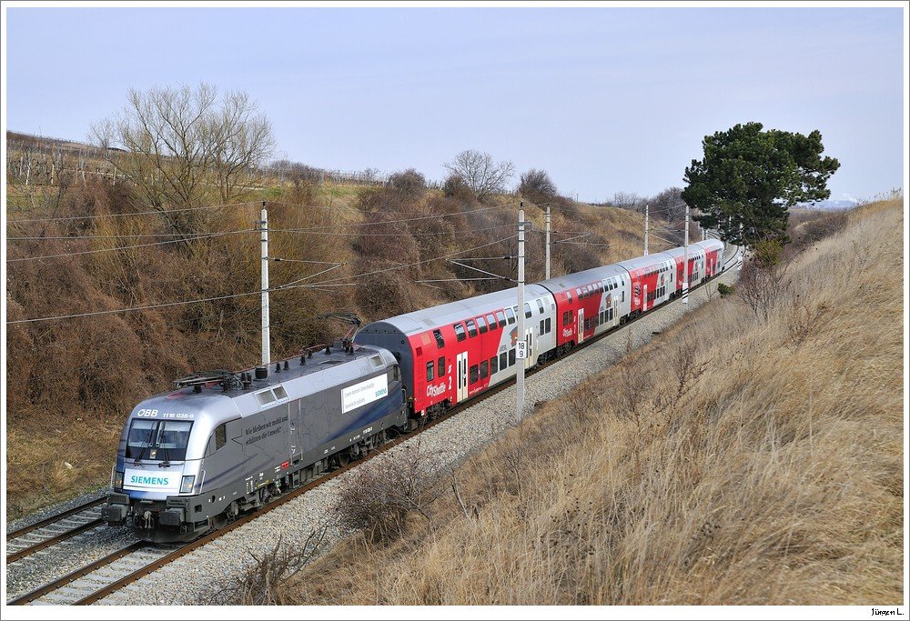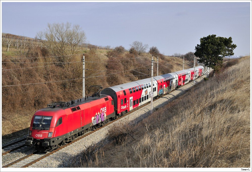 1116.072 mit dem R2319 bei Guntramsdorf-Südbahn; 6.3.2010. Die Lok trägt ein Graffito. "JPEG" - was wollen uns die Sprayer damit sagen? Ich jedenfalls fotografiere in RAW. *gg*