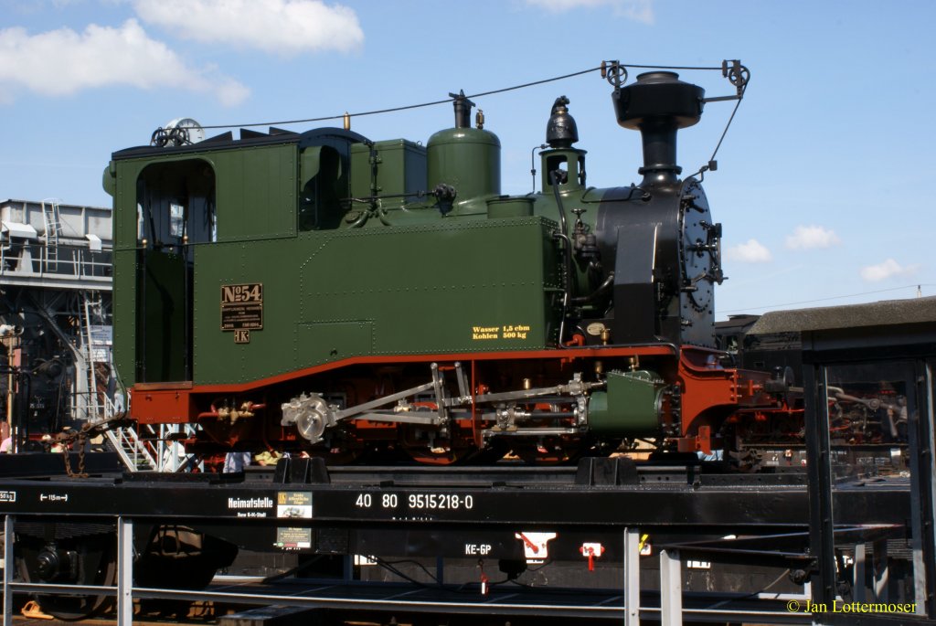 23.08.2009. Die sächsische I K Nr-54 auf dem Laufsteg beim 19. Heizhausfest in Chemnitz. Gut zu sehen die Heberleinbremse. Der gesamte Zug wird über das auf dem Dach geführten Drahtseil gebremst. Jeder Wagen muß in dieses Seil eingehakt werden (jeder Wagen hat ein Seil, das über die gesammte Dachlänge reicht). Über mehrere Hebel und Gelenke wird die Bremswirkung auf die Räder der Wagen umgelenkt.