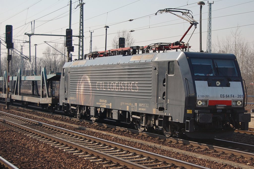 ES 64 F4 - 201 der CTL Logistik mit einem leeren Autotransportzug bei der Einfahrt in den Bahnhof Berlin Schönefeld. 09.03.2010
