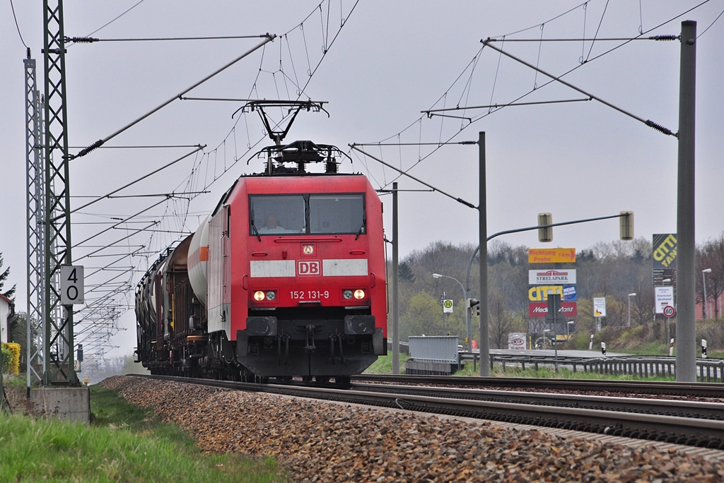 152 131 kommt mit einem "schweren Zug", genannt Lumpi, den Langendorfer Berg bei Stralsund hoch Richtung Rostock am 27.04.2010