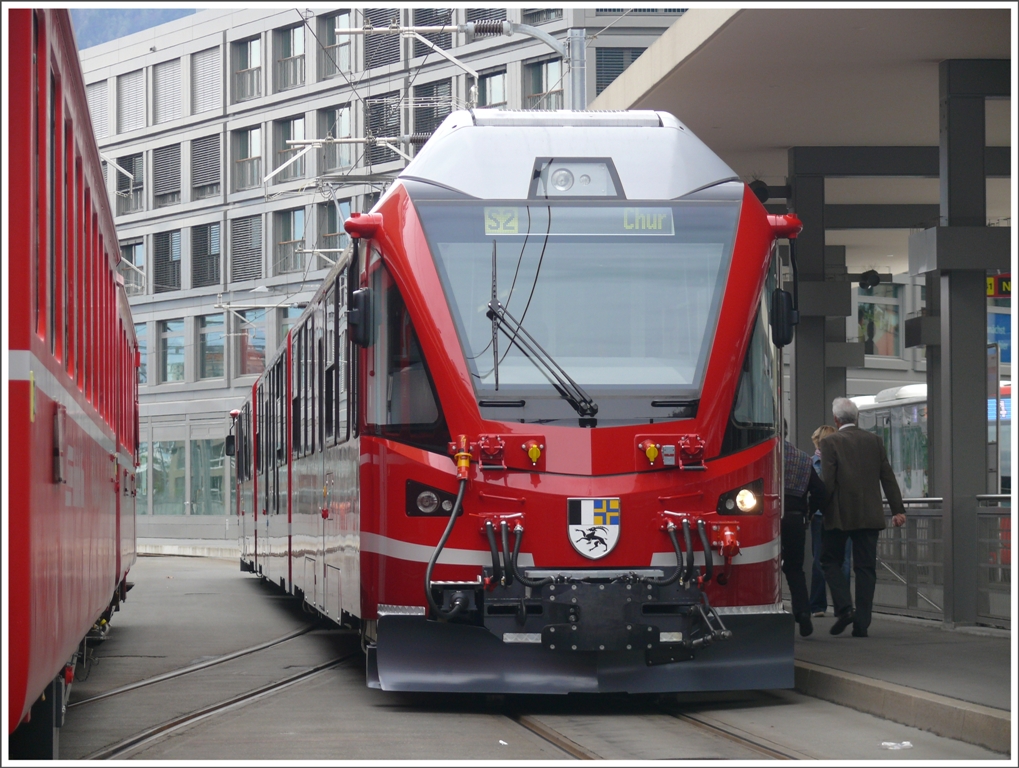 Fünf Allegra-Triebzüge sind mittlerweilen abgeliefert von Stadler Rail an die RhB. Die Züge 3501 - 3504 wurden heute in Landquart getauft. Um 11.10Uhr fuhr der Allegra 3503 aus Arosa kommend ab Gleis 1 in Chur direkt Richtung Landquart mit Überqueren der SBB-Geleise. Ab dem Arosaareal gibt es normalerweise keine Passagierzüge nach Landquart. (01.05.2010)