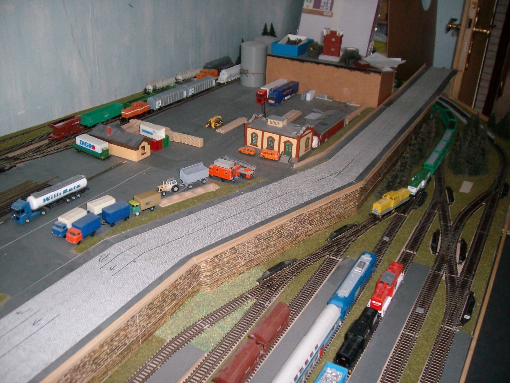 Hier ist die rechte Seite meiner Eisenbahnplatte.Rechts ist der der Hbf mit einen Gleis, daß nach oben führt und daneben das untenrum führende Gleis.Links ist der Holzbetrieb zu sehen.