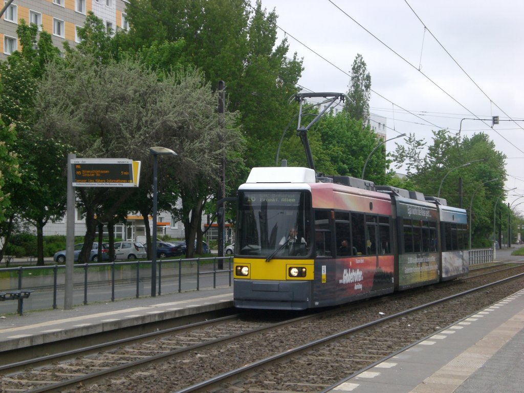 Berlin: Straßenbahnlinie 16 nach S+U Bahnhof Frankfurter Allee an der Haltestelle Hohenschönhausen Hohenschönhauser Straße/Weißenseer Weg.(14.5.2010)
