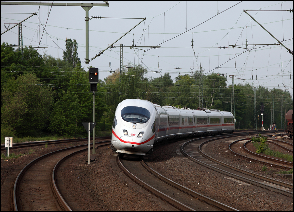 Ein 403er legt sich als ICE 616, München Hbf - Stuttgart Hbf - Dortmund Hbf, bei Bochum-Ehrenfeld in die Kurve. (16.05.2010)