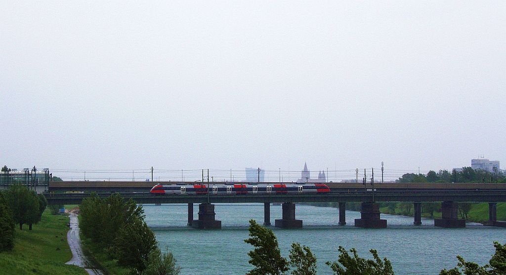 Schlechtwetteraufnahme eines Talents 4124 auf der S-Bahn Stammstrecke bei der Überquerung der Brücke über die Neue Donau/Wien. 16.5.10