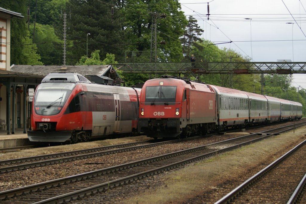 Auf dem Durchfahrtsgleis Richtung St.Pölten braust gerade die 1216 240 mit ihren IC746 "Licht für die Welt" Salzburg entgegen. Auf dem neben Gleis im Bahnhof Rekawinkel steht der Talent 4024 126 und wird in Kürze in Richtung Wien West abfahren. 15.5.2010
