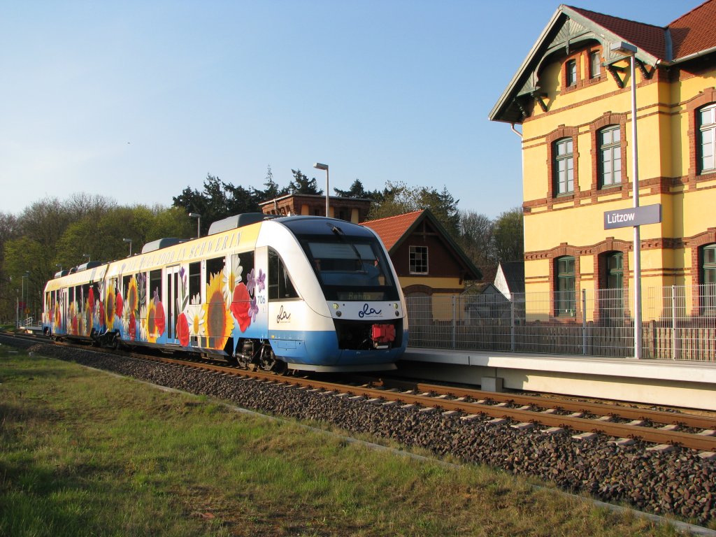 Am Haltepunkt von Lützow an der Strecke von Schwerin HBF nach Rehna legt VT 706 der OLA einen kurzen Halt ein um weiter in Richtung Rehna zu fahren am 25.04.2010