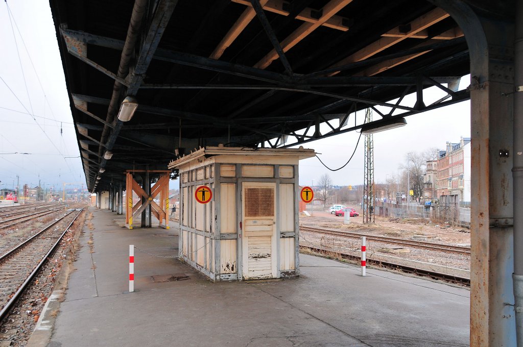 Großbaustelle Chemnitz Hbf am 02.03.10 (IV): Ein kleines Häuschen auf den Aussenbahnsteigen 16/17 hat (noch) überlebt