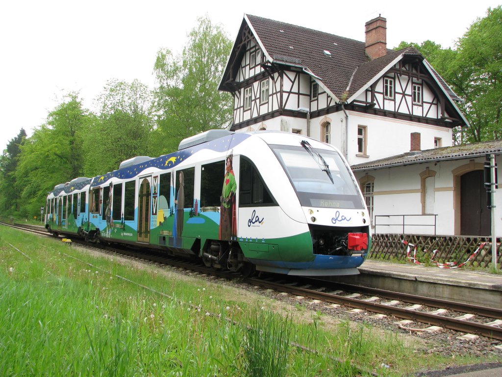 Die 38 1301 am 22.05.2010 bei der Ausfahrt mit einem Pendelzug aus Neuenmarkt-Wirsberg wehrend die V60 114 mit Rangierarbeiten beschäftigt ist.