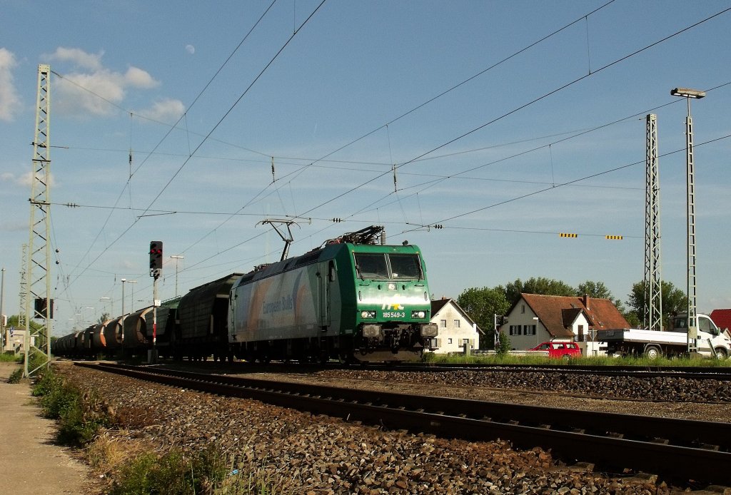Trotz Streckensperrung wegen des Felsentores fuhren ein paar Güterzüge. Einer davon wurde von der 185 549 der Rail 4 Chem bespannt. Diese Sonnt sich am 23.05.2010 in Mangodling