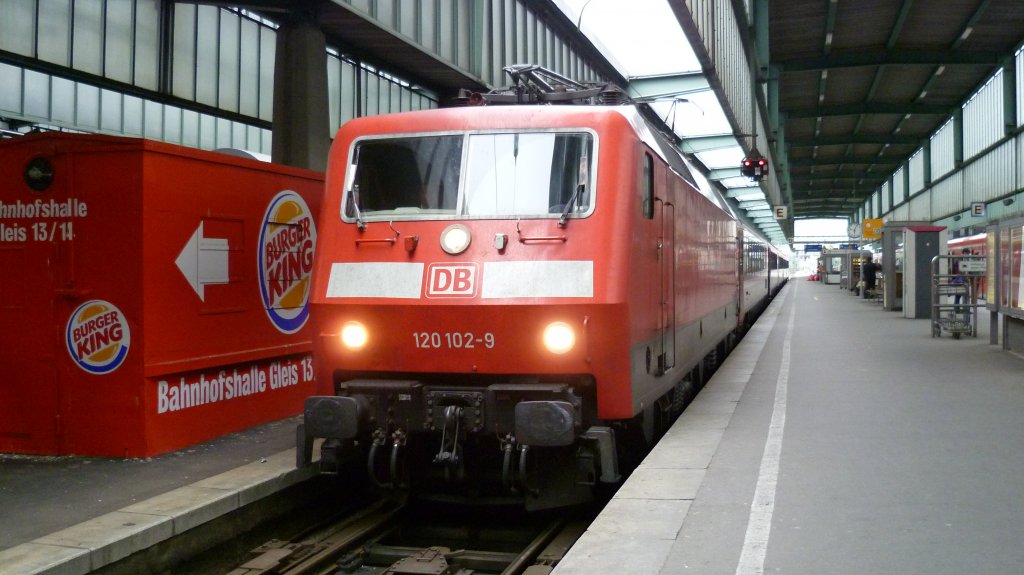 120 159-9 mit ihrer Märklin-Werbung steht im Kopfbahnhof des Münchner Hbf's, 19.03.2010