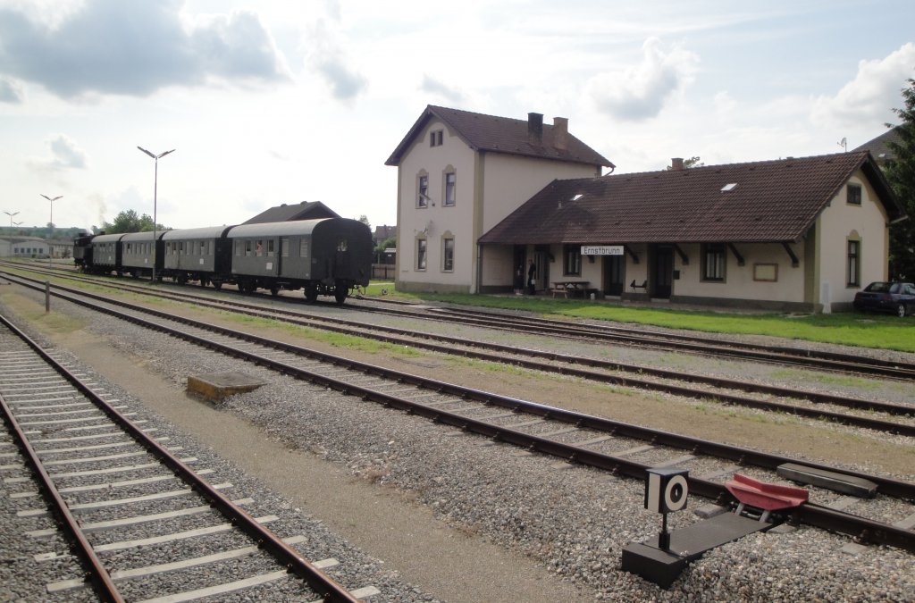 145 023-6 der Pressnitztalbahn abgestellt mit einem Sonderzug zum Münchner Kirchentag im Bahnhof von Moosach. Fotografiert am 15. Mai 2010.