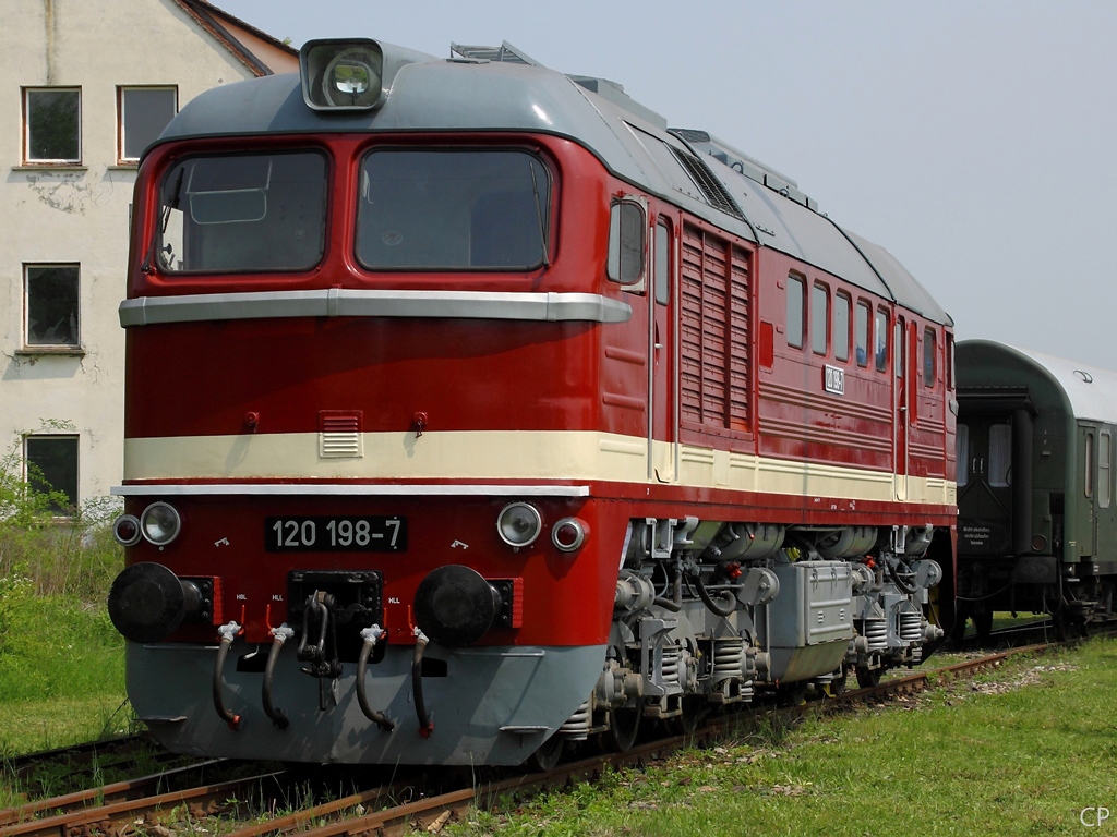 Die bestens gepflegte Taigatrommel 120 198-7 steht am 29.5.2010 im Bw Weimar. Zu ihrer aktiven Zeit wird sie in den seltensten Fällen so geglänzt haben.