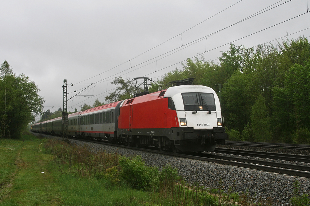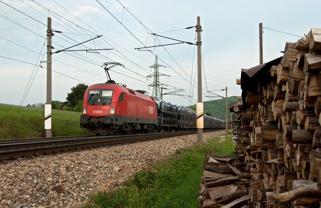 1016 026 mit einem Autoganzzug am 30.04.2010 um 18:45 Richtung Westen. Die Aufnahme entstand kurz vor Rekawinkel.