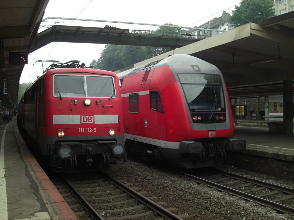 8.8.09, Wuppertal Hbf. Die 111 112 fährt mit dem RE4 ein, daneben wartet ein RE7 auf die Ausfahrt.
