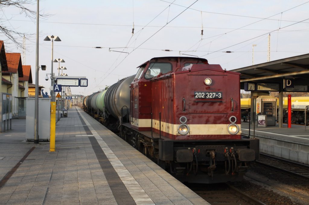 202 327 in Originalfarben kommt mit Kesselwaggons durch Neustrelitz gefahren. 06.04.2010