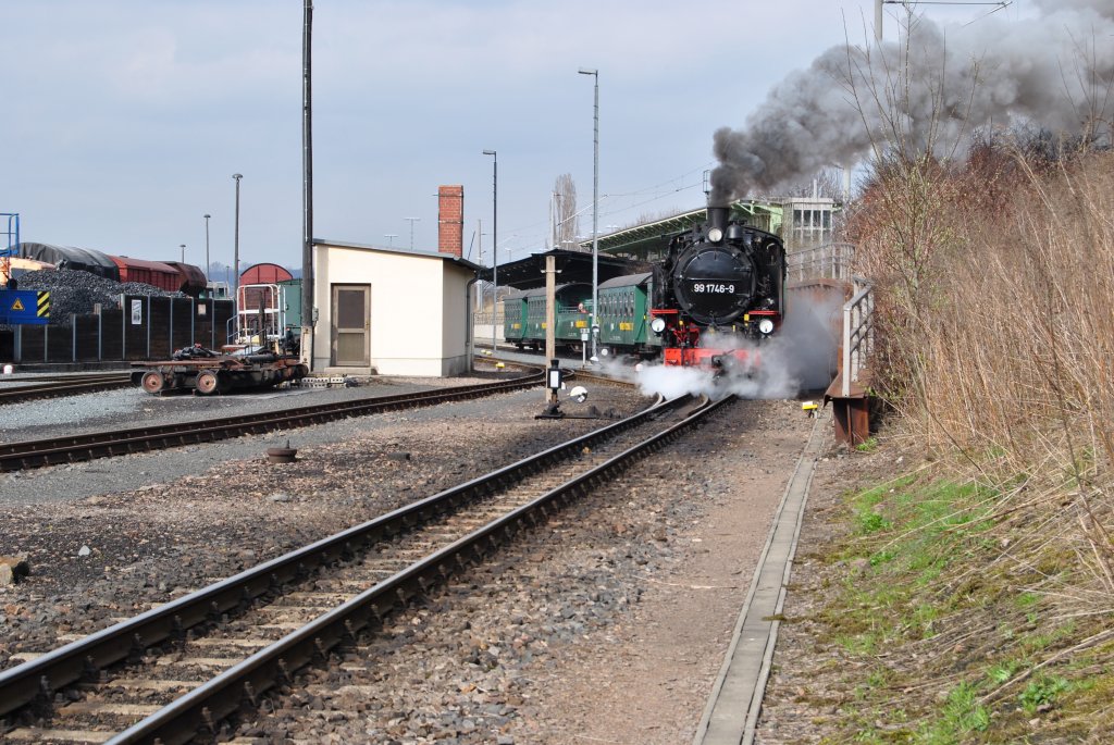 99 1746-9 hat am 16.04.2010 den Bahnhof Dippoldiswalde erreicht und wird vor der Rückfahrt nach Freital mit Wasser versorgt. Sie steht am Wasserkran wird aber per Schlauch befüllt?