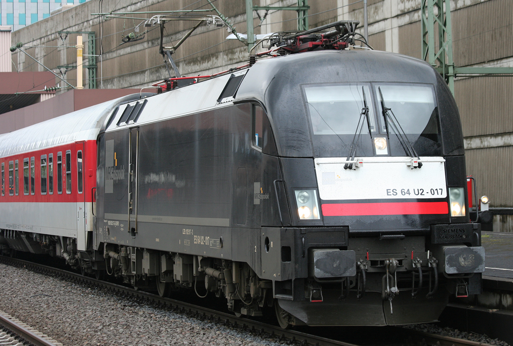 Die 182 517-3 / ES 64 U2 - 017 der MRCE zieht den zu bereitstellenden AZ in Düsseldorf HBF am 07.05.2010 bereit