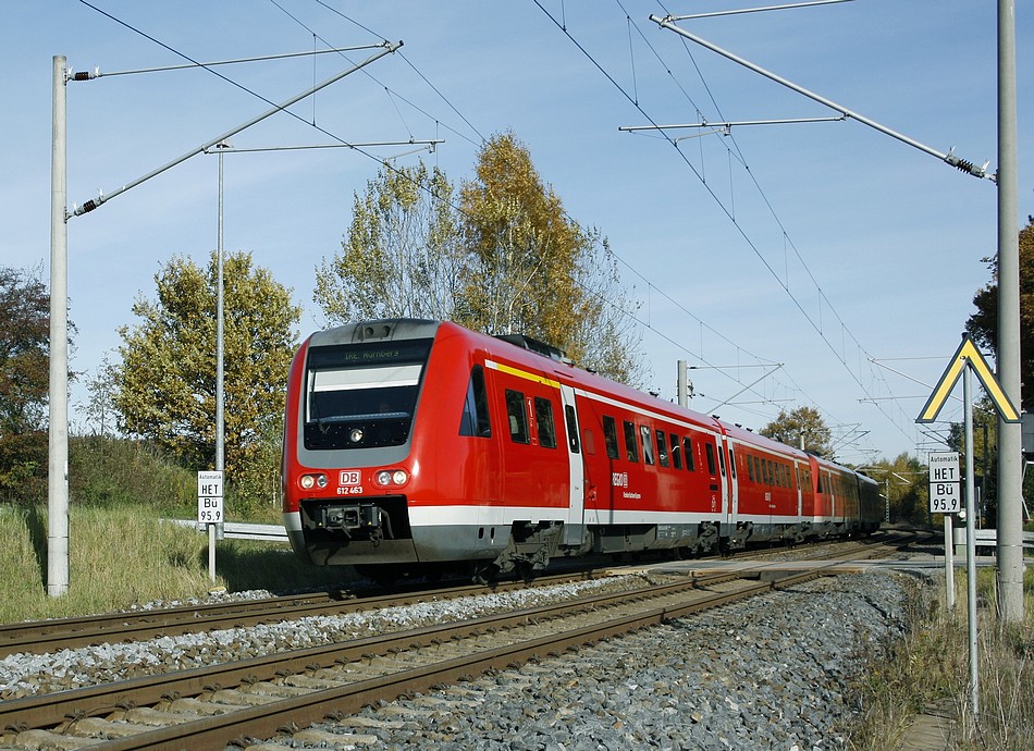 Am 29.10.2010 durchfährt ein RE mit dem Triebwagen 612 463 voran, den BÜ in Oberlungwitz Richtung Hohenstein-Ernstahl.