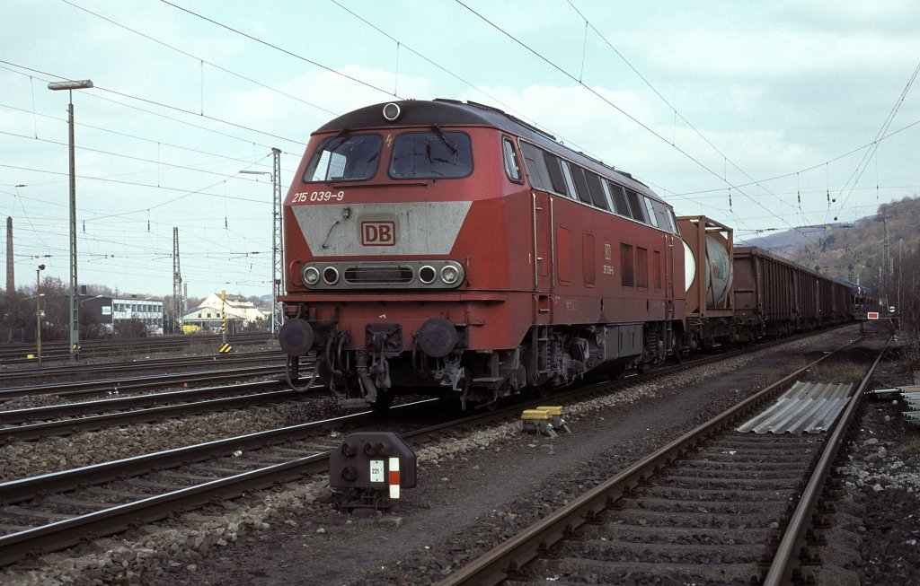 Ein einfahrender ICE passiert auf ihren Einsatz wartende 218er Diesellokomotiven.