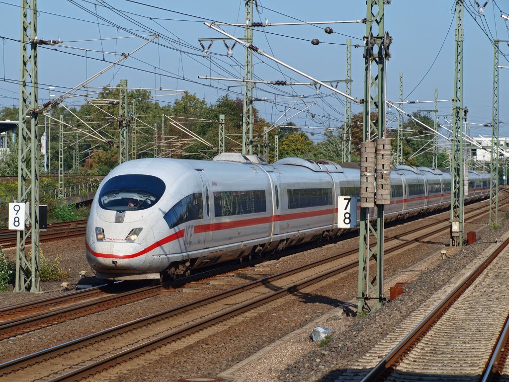 Eine High-Speed ICE 3 Doppelzuggarnitur von Köln Hbf kommend auf dem Werg Richtung Süden am 09.10.2010 am S-Bahnhof Steinstrasse in Köln Porz.