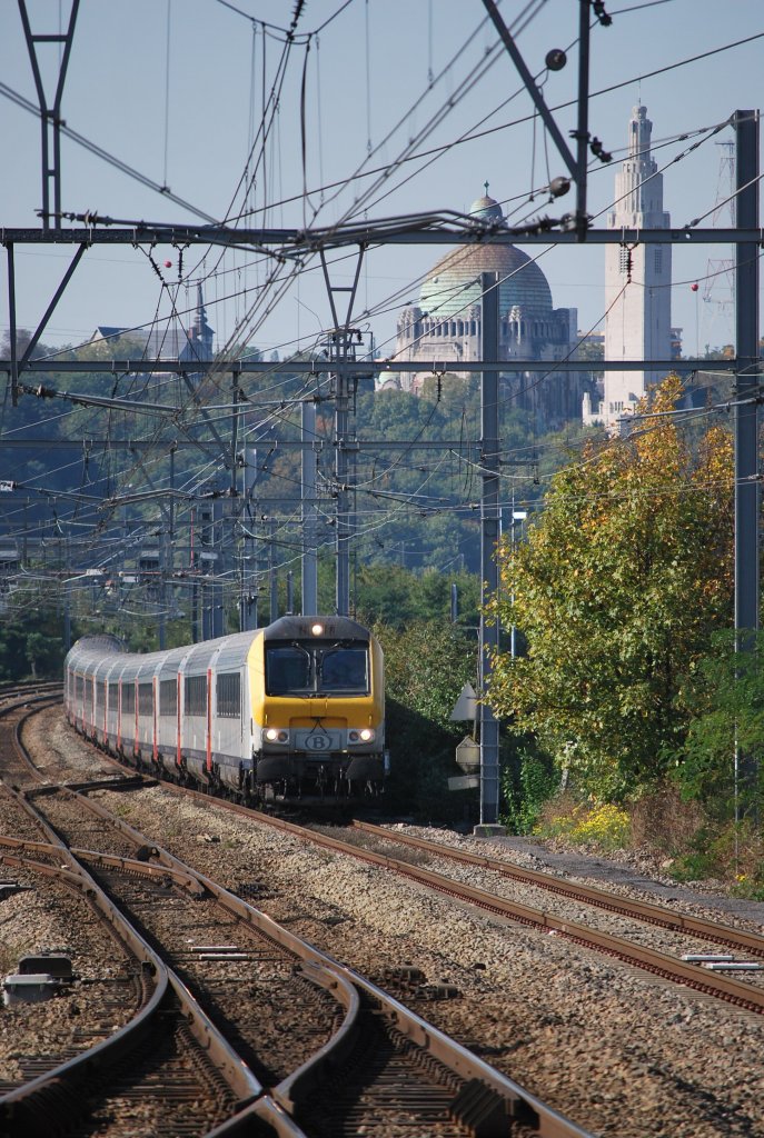 IC-Zug Oostende-Eupen nähert sich dem Bahnhof Angleur mit Steuerwagen am Kopf. Im Hintergrund steht die Gedenkstätte der Alliierten von Cointe. 9. Oktober 2010.
