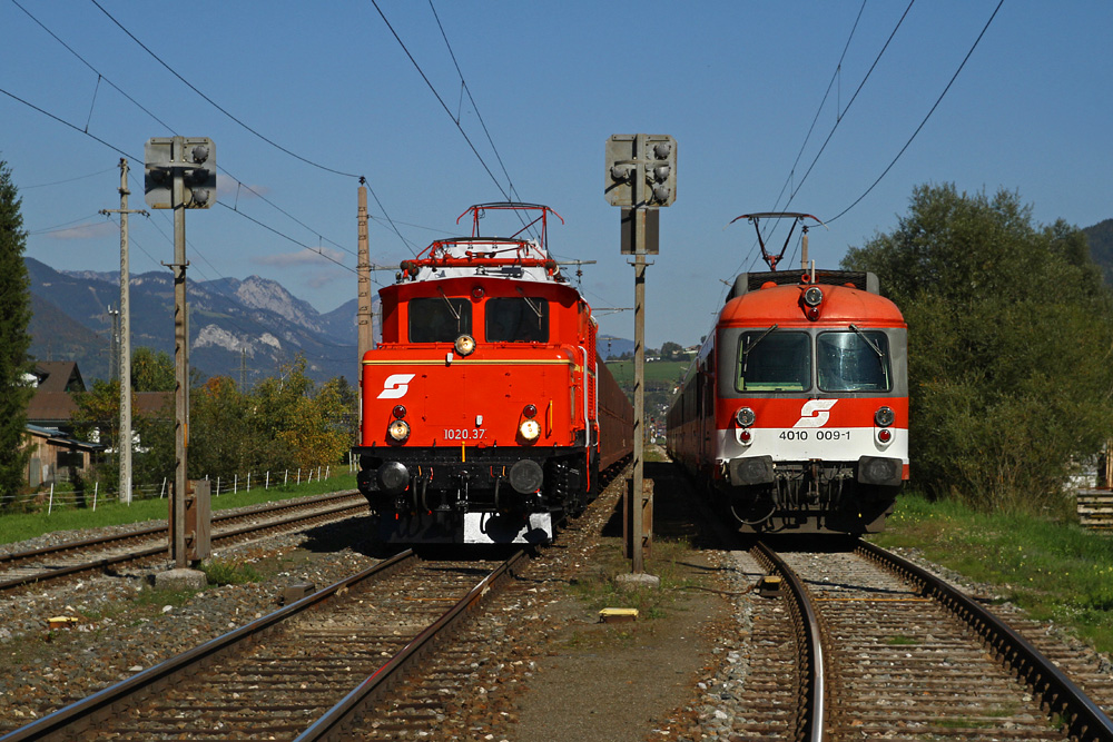 ÖGEG 4010 009 als SLP 14268 nach Bischofshofen neben ÖGEG 1020.37 mit dem über das Ennstal umgeleiteten 90407 am 4.10.2010 beim Halt in Mandling.