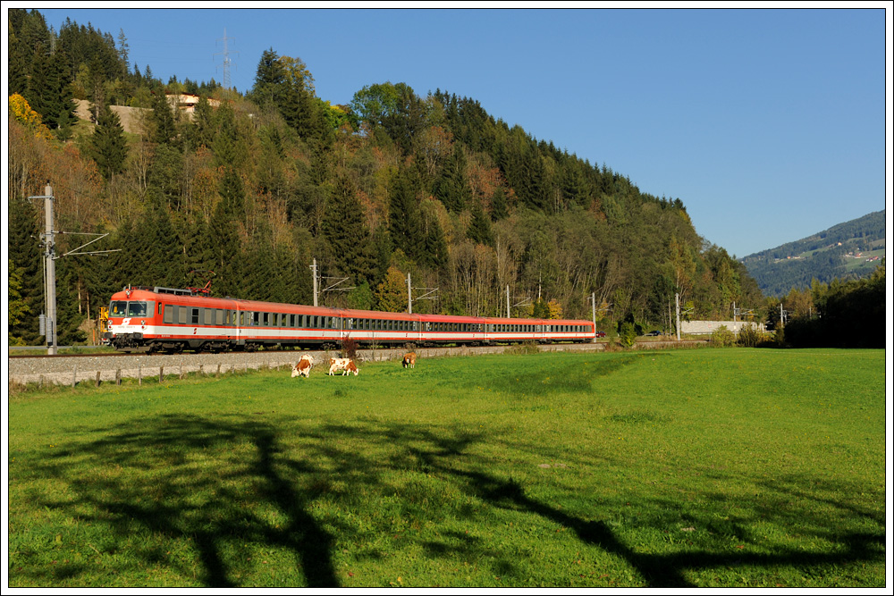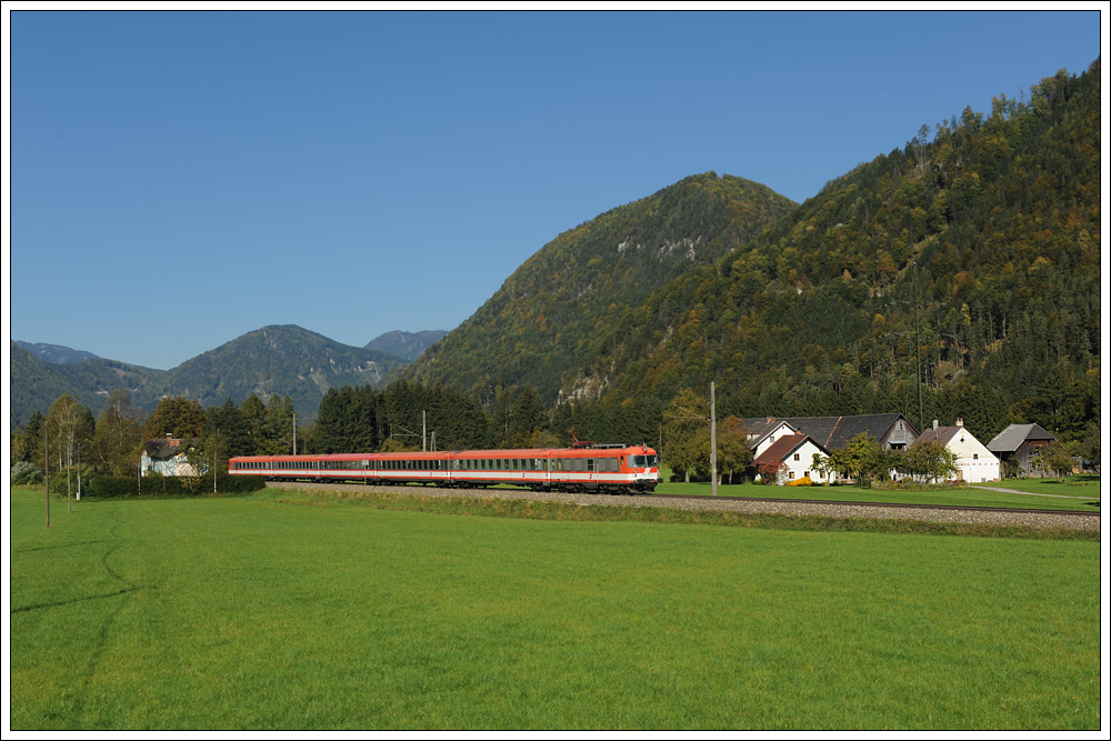 4010 009 der ÖGEG (Österreichische Gesellschaft für Eisenbahngeschichte), fährt als Planstrom SDZ von Linz nach Bischofshofen.Dank einer perfekten Organisation konne dieser Zug auch noch bei einer Nebenfahrt auf der Salzkammergutbahn abgelichtet werden. Stainach 4.10.2010