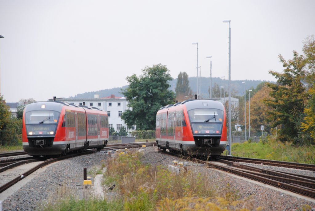 7.10.2010 17:31 DB AG Baureihe 642 071 als RB nach Saalfeld (Saale) bei der Ausfahrt aus Gera Hbf und Baureihe 642 511 auf Dienstfahrt bei der Einfahrt in Gera Hbf.