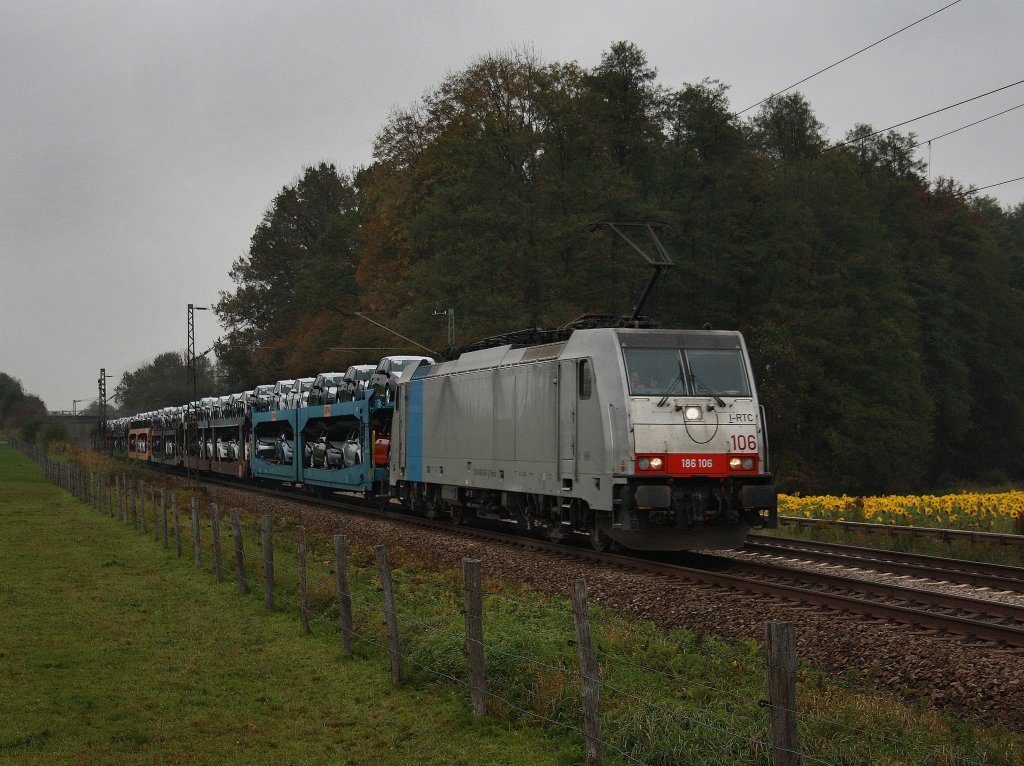 Die 186 106 am 14.10.2010 mit einem Autozug unterwegs bei Großkarolinenfeld. (BÜ Vogl)