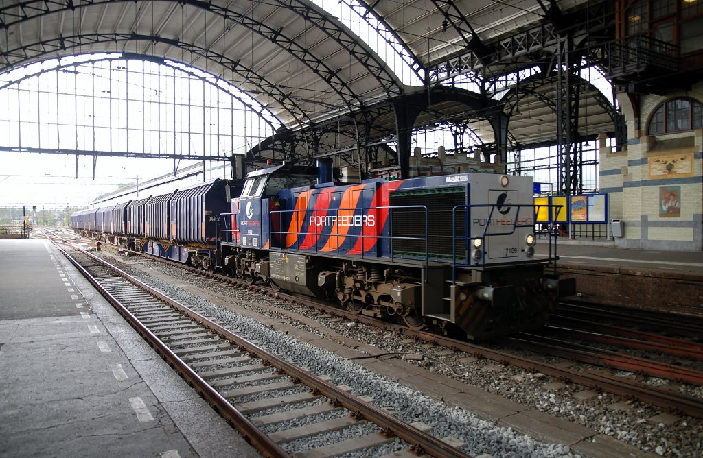 Die Portfeeders 7109 mit Abfahlzug fährt durch Haarlem Hbf am 14.10 2010.