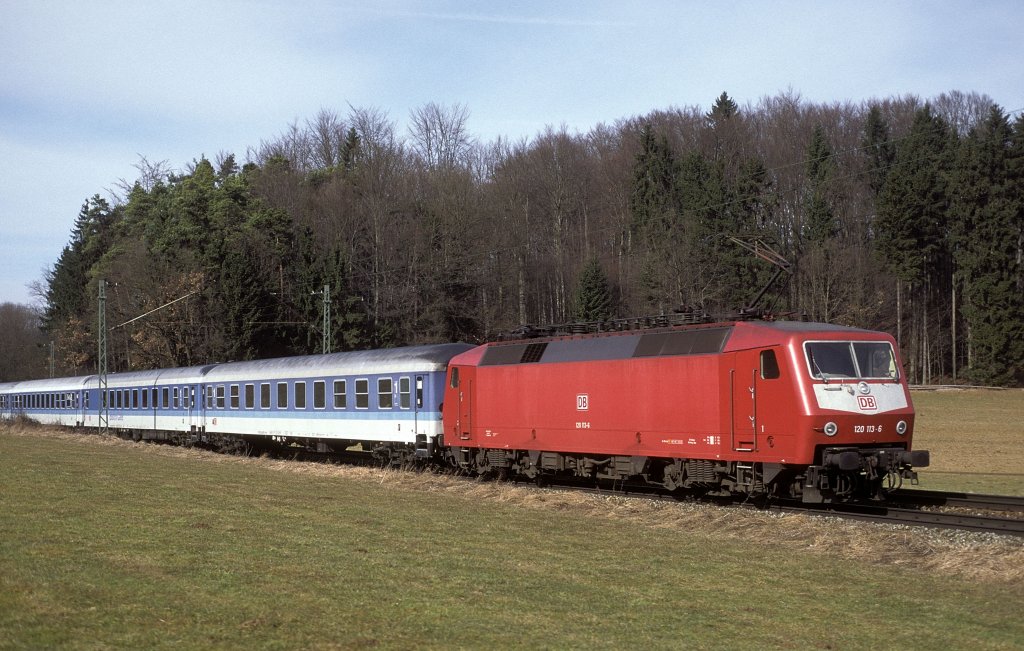 Die 101 093-3 mit einem gemischten Personenwagen Zug bei Istein gen Norden.
